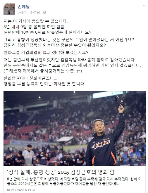 https://www.facebook.com/sohnhyewon?fref=ts 손위원장과 야구팬들 사이에서 있던일은 팩트고요. 야구커뮤니티가 아니라 sns에 글 쓰신겁니다. 그리고 이런걸로 사회적물의라고도 생각안하고요.