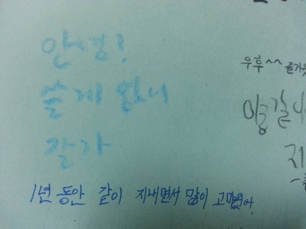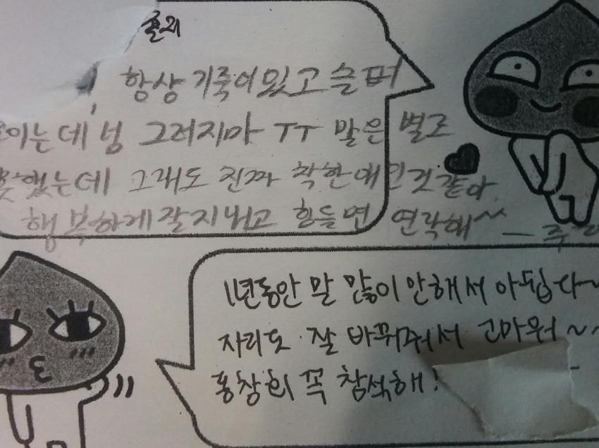저거 말고 그 말 없는 당사자가 다른 친구 롤링페이퍼에 덕담 써놓으면 거기다 리플로 "와 글로는 말 잘하네!"라고 달아 놓는게 있습니다 크크