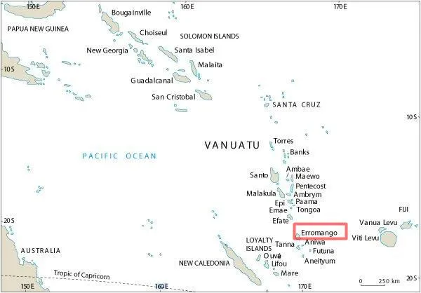 사실 현지어로는 에로망오(Erromango)섬인데, 옛날엔 일본어로 에로망가(エロマンガ)로 표기했다.[2] 문제는 국내 시중에 팔리는 세계 지도나 교과서용 사회과부도에도 에로망오나 에로망고가 아닌 에로망가로 실려 있는데 이는 과거에 이런저런 자료들을 수집할 때 일본 책에서 참고하는 경우가 많았기 때문이다.