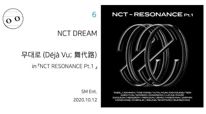 앞선 문단들에서 언급한 2020년 케이팝의 하이퍼함이 가장 효과적으로 드러난 트랙은 역시 SM 엔터테인먼트의 것이었다. 지난 2010년대의 케이팝 시장에서 음악을 이끌었던 SM 엔터는 2020년에 들어 NCT라는 존재와 함께 다시금 새로운 스타일을 선두하고 있다. 특히 NCT 2020의 다양한 활동 중에서도 NCT DREAM의 「무대로 (Déjà Vu; 舞代路)」는 케이팝과 하이퍼-팝의 중심을 효과적으로 잡아내면서도 자신의 색을 잘 가미한 트랙으로 자리한다. 기존 NCT DREAM의 색이었던 역동적인 스타일과 쾌활한 분위기를 녹여낸 「무대로」는 그러한 기존의 색채 가운데에서도 하이퍼 한 소리들을 중심으로 사운드를 구축하여 새로운 스타일을 녹여낸다.
