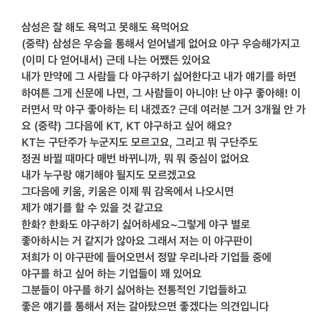뭐 얼마나 가나 두고 봅시다. 저는 롯데얘기도 공감이 안가는데 전이면 몰라도 메이저 출신 단장 데려오고 이대호 계약도 회장이 직접 지시하고, 비싼 데이터장비도 새로 들여오고 할건 다하고 있던데 대체 팀에 대한 애정과 투자를 어떻게 생각하길래 저런말을 하는지 모르겠어요