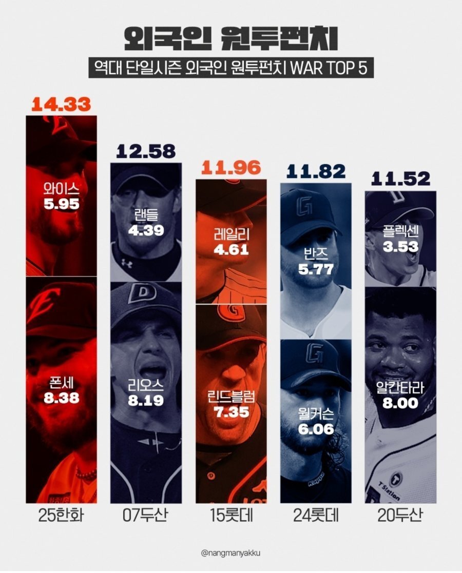 Subject [스포츠] 역대 단일시즌 외인 원투펀치 war 순위 TOP5 (수정됨)