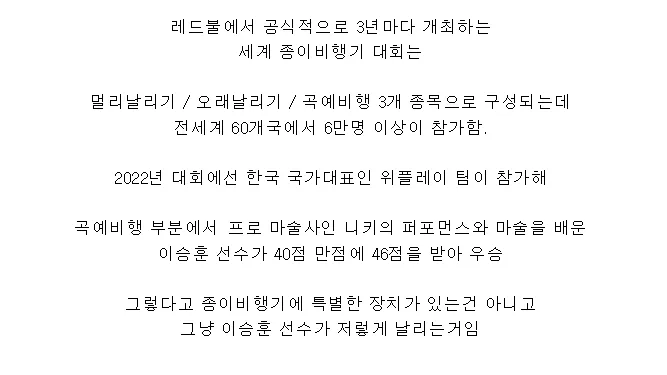 마술사 니키님 유튜브 보시면 엄청 재미있습니다. 종이날리기팀 위플레이님과 협업하여 이번 대회 준비해서 대상을 받게 되는 내용이 잘 나와있습니다. 내용도 재미있고 교육적인 내용도 많이 있어 아들과 같이 재미있게 봤었네요 이 대회는 레드불에서 개최하는 종이비행기 대회이구요. 멀리날리기, 오래날리기, 곡예비행 부분에서 경쟁하는 큰 대회더라구요. 위에 영상들은 곡예비행 부분 영상입니다